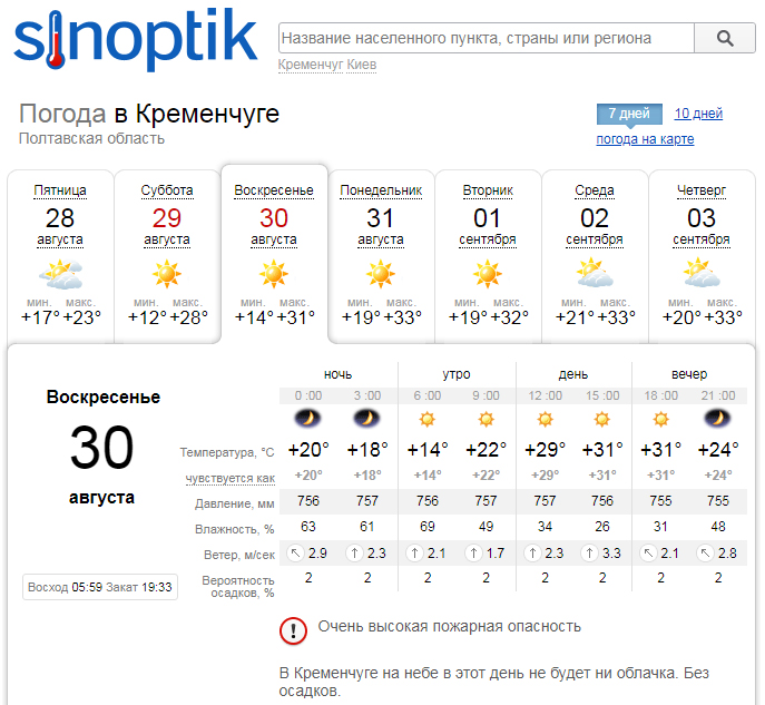 Sinoptik прогнозирует исключительно ясную погоду на выходных, без осадков и облачности. Воздух прогреется от +12-14°С по утрам до +28-31°С днём. Также этот погодный сайт предупреждает об очень высокой пожарной опасности.