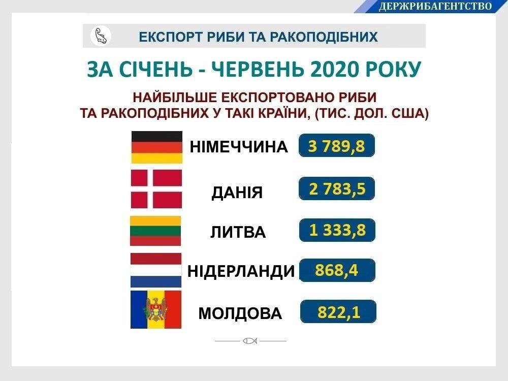 Так, 27% всього експорту української риби та ракоподібних у грошовому вимірі припадає на Німеччину (3 789,8 тис. дол. США). До Данії поставлено 20% продукції на 2 783,5 тис. дол. США. Також значні поставки здійснено до Литви (на 1 333,8 тис. дол. США), Нідерландів (на 868,4 тис. дол. США), Молдови (на 822,1 тис. дол. США), Японії (на 691,7 тис. дол. США), Туреччини (на 679 тис. дол. США) та Ізраїлю (на 661,3 тис. дол. США).