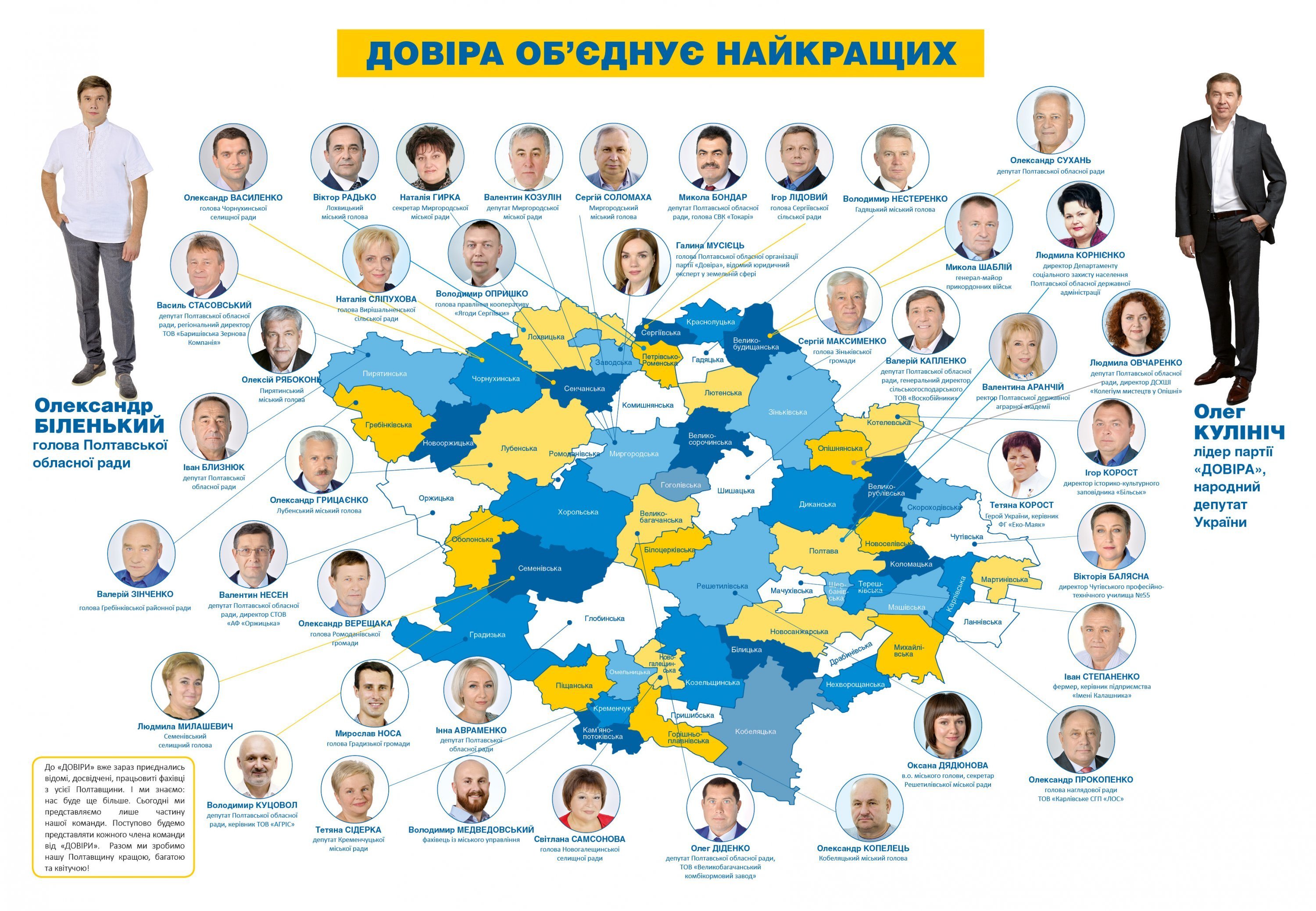 До команди «Довіри» приєднався голова Полтавської обласної ради Олександр Біленький, майже половина діючих успішних голів об’єднаних громад Полтавщини, рейтингові обласні депутати, громадські діячі, лікарі, викладачі, працівники аграрного сектору та промисловці області.