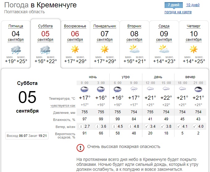 По версии Sinoptik, в первой половине дня в субботу, 5 сентября, в Кременчуге будет идти достаточно сильный дождь, который начнётся ещё ночью. Зато в воскресенье, 6 сентября, фактически лето вернётся в город: день будет богат на солнечные лучи и тепло. Воздух прогреется от +16-22°С (в субботу) до +17-29°С (в воскресенье). Обратите внимание, этот портал предупреждает об очень высокой пожарной опасности в выходные, будьте осторожны.