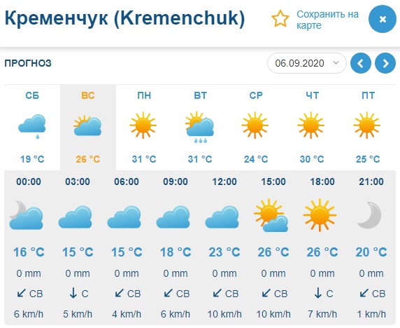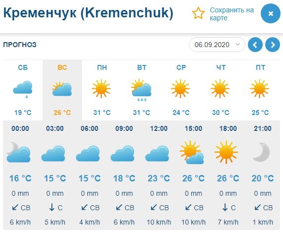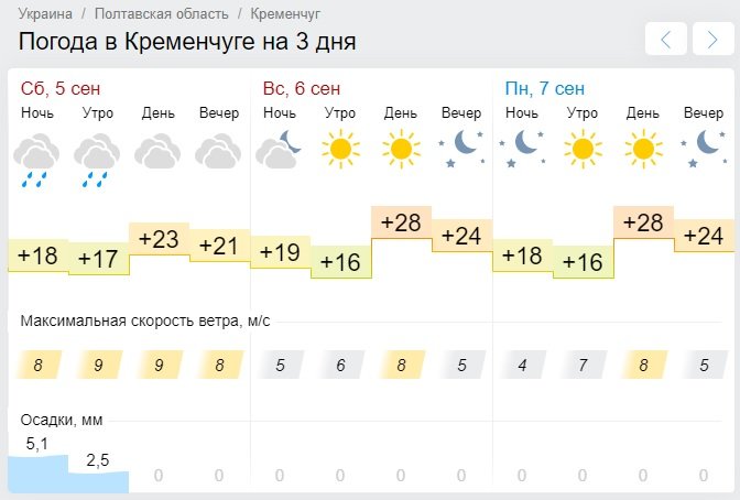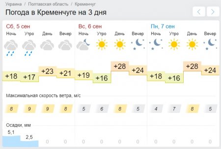 Что касается Gismeteo, он рисует подобную картину: дожди зальют Кременчуг ночью и утром в субботу, 5 сентября, зато на смену такому пасмурному дню придёт жаркое и ясное воскресенье, 6 сентября. Столбики термометров покажут от +16°С до +28°С.