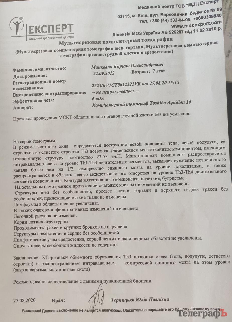 Юний кременчужанин Кирило Мацкевич потребує допомоги в пересадці імпланту. 7-річному хлопцю лікарі встановили діагноз аневризмальна кісткова кіста 3-го грудного хребця.