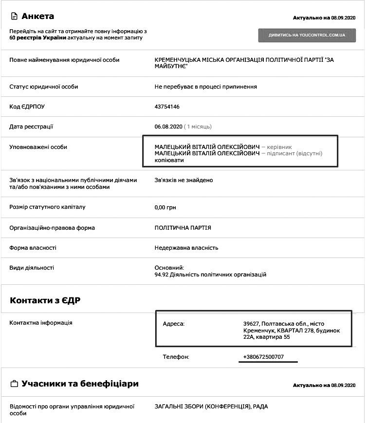 6 серпня цього року в Кременчуці офіційно зареєстровано міський осередок партії «За майбутнє». Його керівником у реєстрі значиться Малецький Віталій Олексійович.