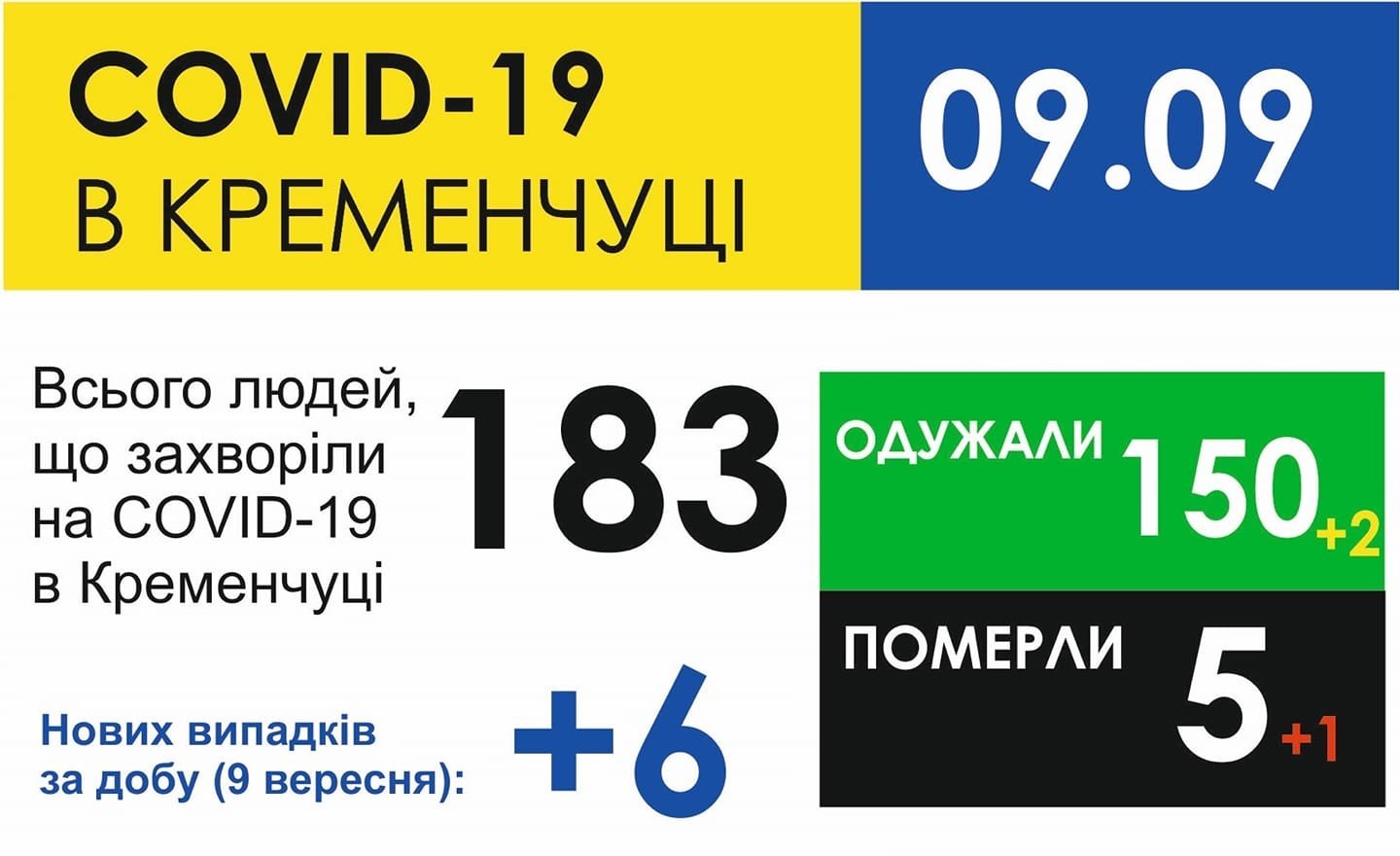 Сьогодні, 9 вересня, у Кременчуці виявлено 6 нових випадків захворювання на COVID- 19. Захворіли чоловіки 49 років, 54 роки, 60 років та жінки 48 років, 55 років, 81 рік.