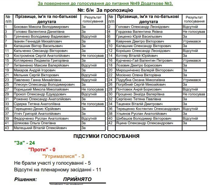 «Не голосував»: Олександр Плескун (раніше за), Микола Порицький (раніше проти), Олександр Яцина (раніше голосував за)