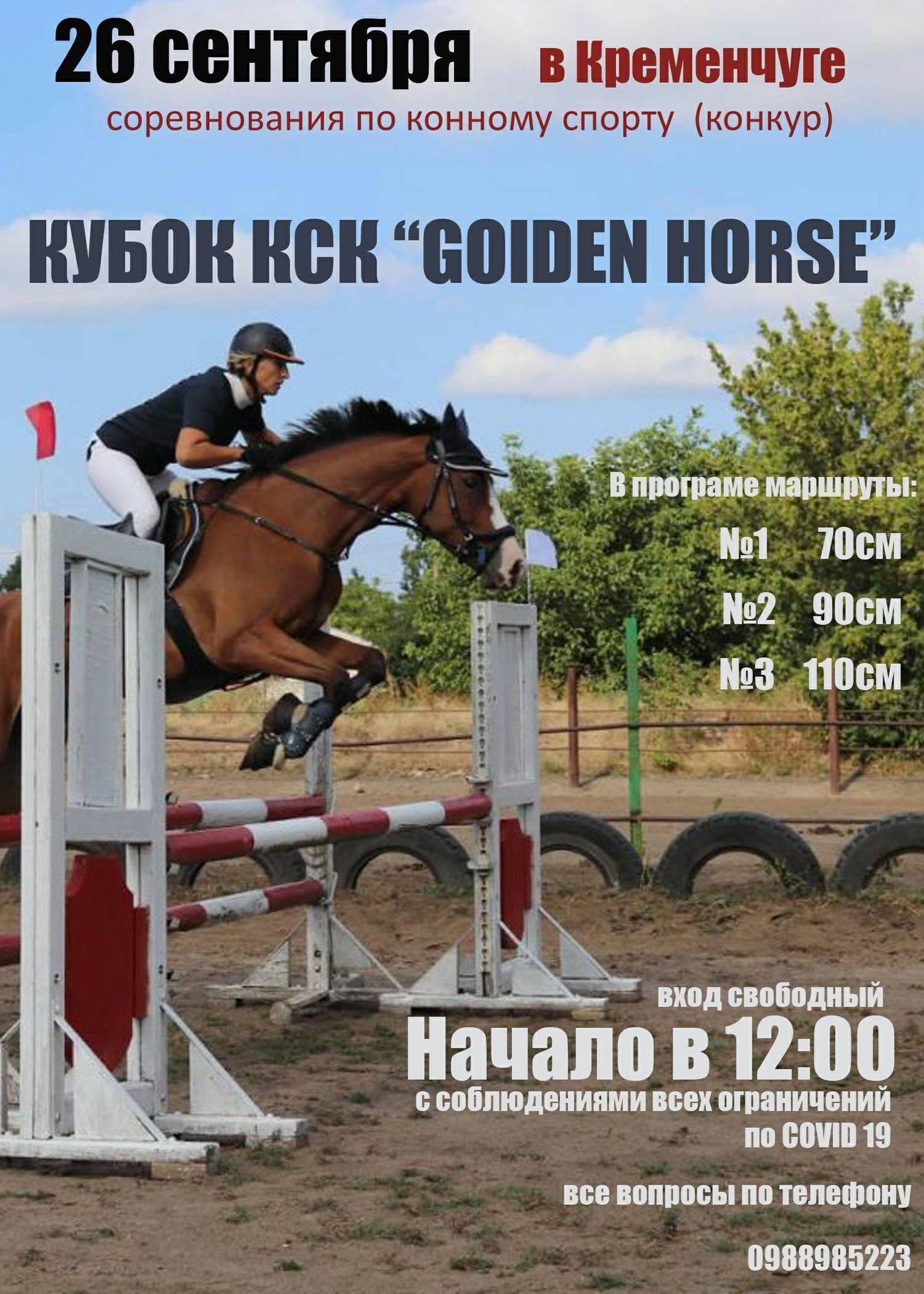 26 вересня у Кременчуці відбудуться змагання з кінного спорту (конкур) Кубок КСК «Golden Horse». Початок змагань о 12.00.