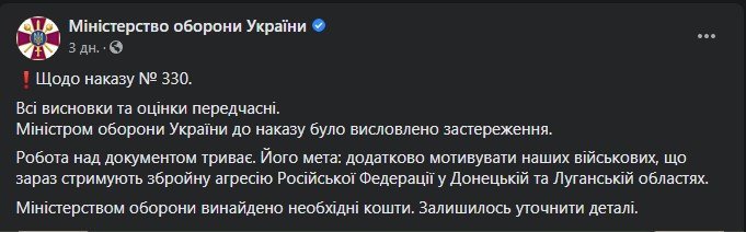 Головний редактор Цензор.НЕТ Юрій Бутусов оприлюднив наказ Міністерства оборони №330. Документ передбачає, що солдатів ЗСУ позбавлятимуть премій за порушення, зокрема за відкритий без наказу вогонь у відповідь на вогонь противника. Наказ №330 міністра оборони Андрія Тарана від 16.09.2020 доведений в усі військові частини на фронті і викликав крайнє обурення серед українських воїнів і дискусію в суспільстві.
