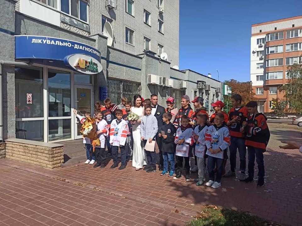 Юні хокеїсти оригінально привітали свого тренера. Вони зібралися біля Відділу державної реєстрації актів цивільного стану та командою привітали народження нової родини. Спортсмени з надією дивляться й сподіваються, що після одруження тренер також буде запізнюватися на тренування.