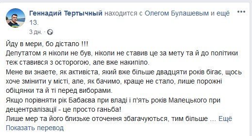 Вот что Тертычный написал о своём решении идти в мэры Кременчуга: