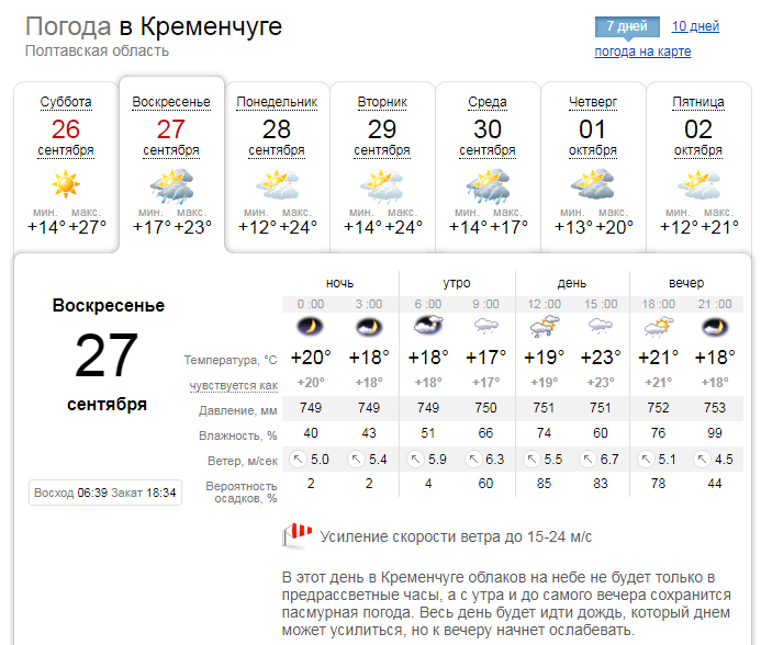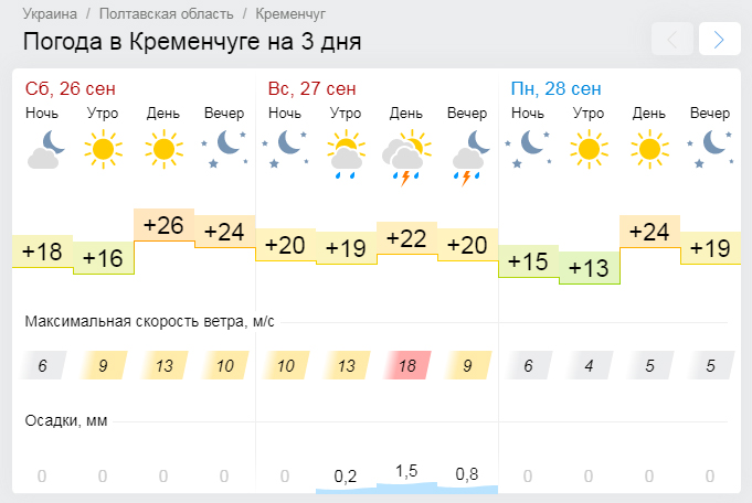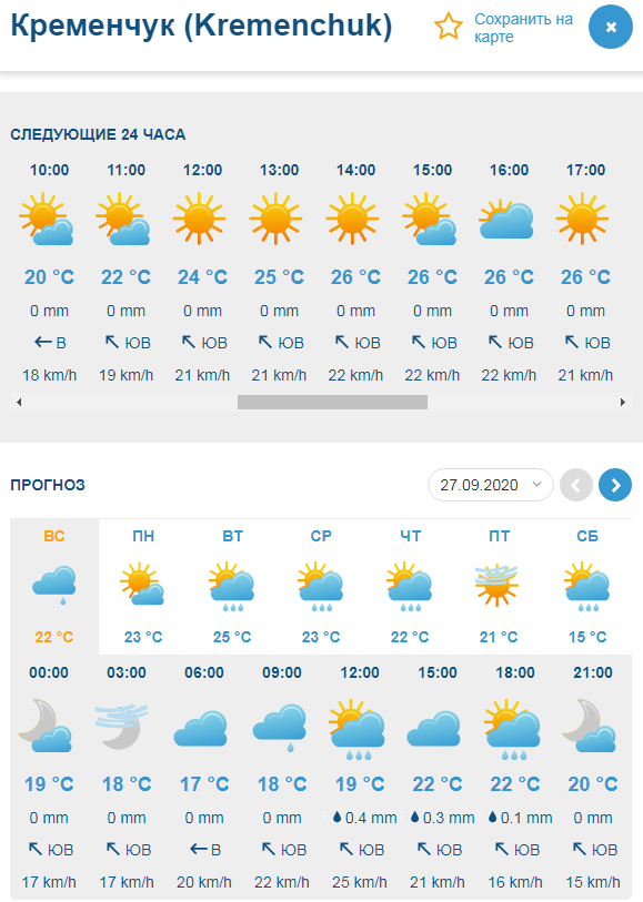 Немного отличается от коллег Ventusky: обещает лишь небольшие кратковременные осадки в воскресенье, 27 сентября, и переменную облачность в субботу, 26 сентября. Температурные показатели на уикенд будут колебаться в пределах +16°С...+26°С. Кременчужанам в выходные стоит ждать мощного ветра, до 25 км/час.