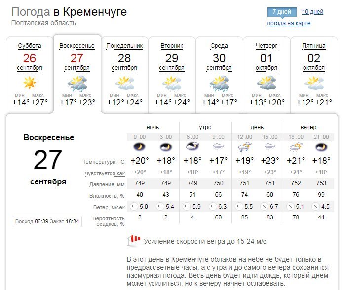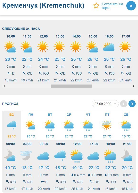 Немного отличается от коллег Ventusky: обещает лишь небольшие кратковременные осадки в воскресенье, 27 сентября, и переменную облачность в субботу, 26 сентября. Температурные показатели на уикенд будут колебаться в пределах +16°С…+26°С. Кременчужанам в выходные стоит ждать мощного ветра, до 25 км/час.