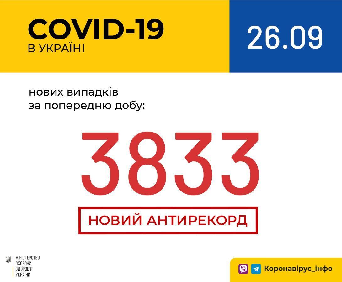 За інформацією МОЗ, станом на 9.00 26 вересня у країні налічують 195 504 лабораторно підтверджені випадки COVID-19, із них 3 903 летальні, 86 873 пацієнти одужало (за добу – 1 740 людей). Загалом провели 2 189 926 тестувань методом ПЛР.