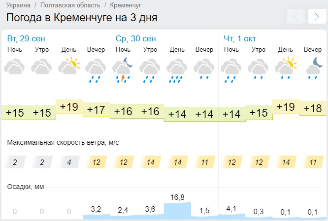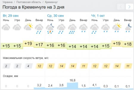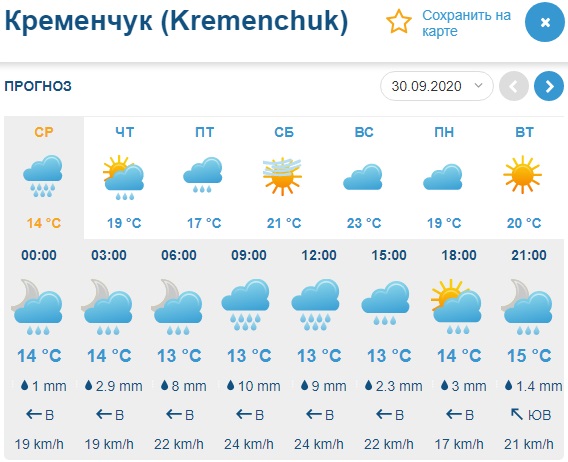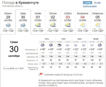 Sinoptik обещает, что обильный дождь, который будет поливать завтра Кременчуг, утихнет только ближе к вечеру. Этот погодный портал предупреждает о усилении скорости ветра до 15-24 м/с. Обратите внимание, что 30 сентября днём будет холоднее, чем в утреннее и вечернее время: +12-13°С против +15-16°С.