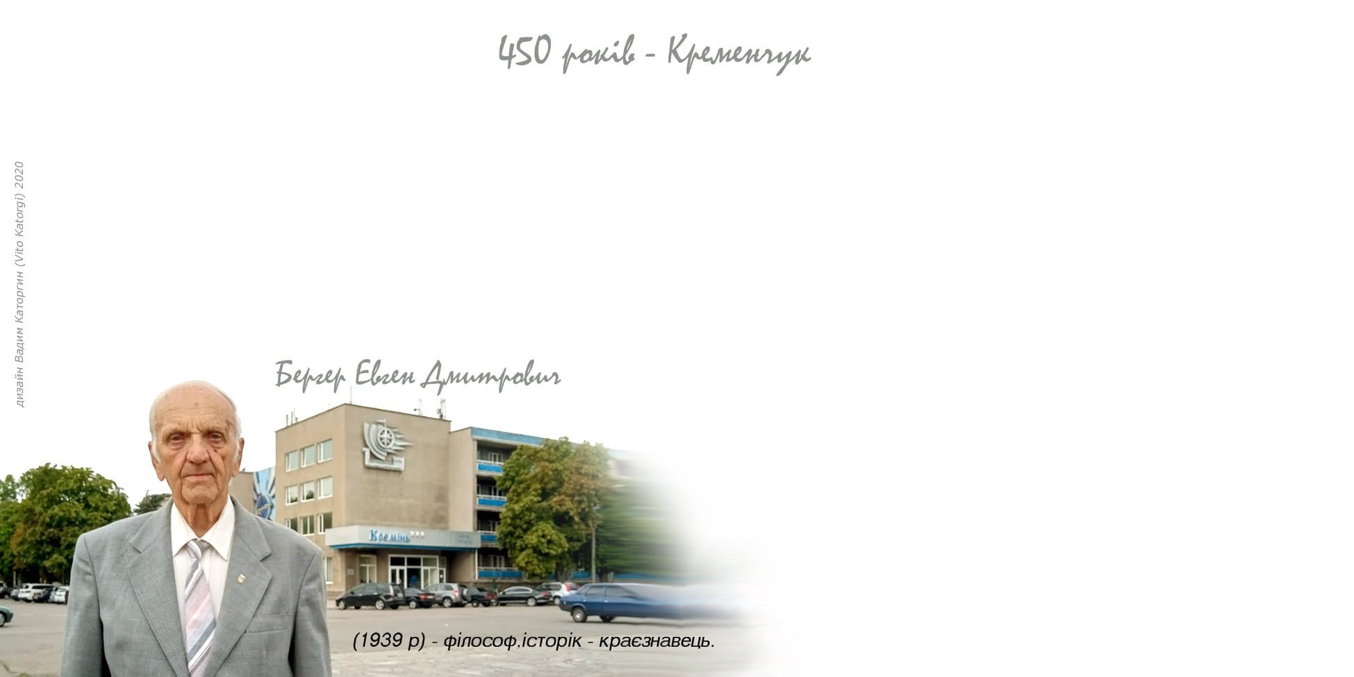 Спілка філателістів Кременчука випустила пам’ятний поштовий конверт із відомим кременчужанином, істориком, краєзнавцем та філософом Євгеном Бергером. За інформацією Володимира Скляра, на конверті фото самого Євгена Дмитровича та напис «450 років – Кременчук». Дизайн підготував кременчуцький художник Вадим Каторгин.