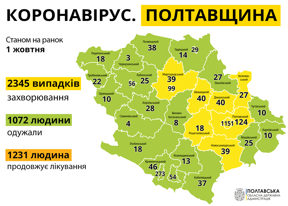 Одужали 1072 жителі області, продовжує лікування 1231 людина, зокрема 80 дітей. Всього в регіоні зареєстрували 42 летальних випадки, нових за добу – 2 (у Полтаві).