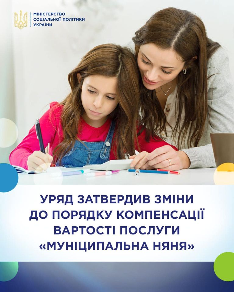 30 вересня уряд на черговому засіданні затвердив постанову «Про внесення змін до Порядку відшкодування вартості послуги з догляду за дитиною до трьох років «Муніципальна няня». Про це йдеться на сторінці у Фейсбуці Міністерства соціальної політики.
