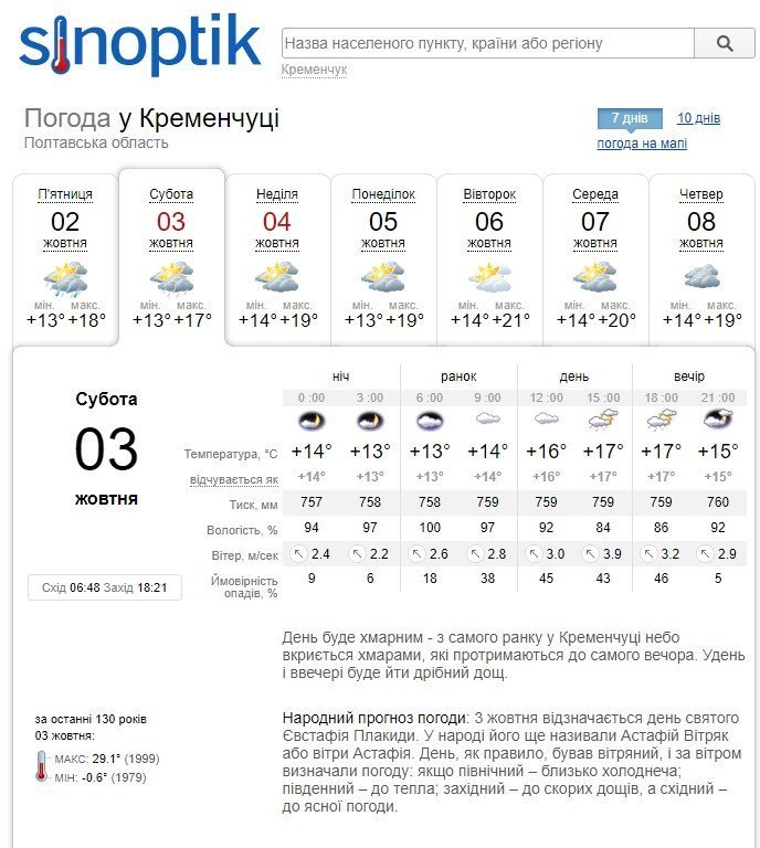 На вихідних у Кременчуці триматиметься відносно тепла погода. Як обіцяє Sinoptik, у суботній вечір кременчужан очікує невеликий дощ. У неділю буде без опадів та хмарно. Хмари тільки ввечері почнуть повільно розсіюватися. Температура в суботу буде коливатися від 13 до 17 градусів, у неділю – від 14 до 19 градусів вище нуля.