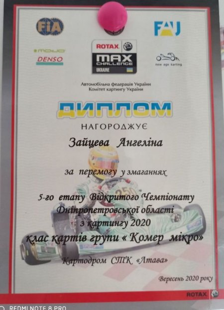 Ангеліна Зайцева, вихованка гуртка картингу Кременчуцького міського центру позашкільної освіти здобула перемогу у 5-му етапі Відкритого чемпіонату Дніпропетровської області з картингу 2020 року у класі картів групи «Комер мікро».