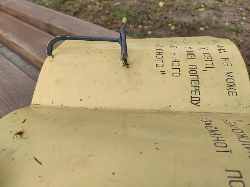 У сквері Макаренка, який відкрили цьогоріч у Крюкові, вандали зламали скульптуру на лаві. Невідомі потрощили арк-об’єкт – окуляри. Інформація про це з’явилася на ФБ-сторінці спільноти «Крюків».