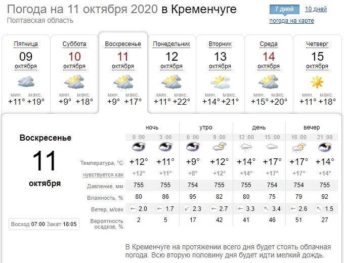 Gismeteo обещает на выходные температурный режим от +11°С до +18°С, а в воскресенье, 11 октября, осадки почти целый день.