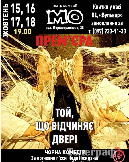 Те, кто не попал на премьеру «Кароля» - не огорчайтесь. Театр в свой юбилейный год припас еще одну премьеру — черную комедию современного автора Неды Нежданы «Той, що відчиняє дверіі». Показы — 15, 16, 17 и 18 октября, в 19.00. Спешите — количество мест ограничено.