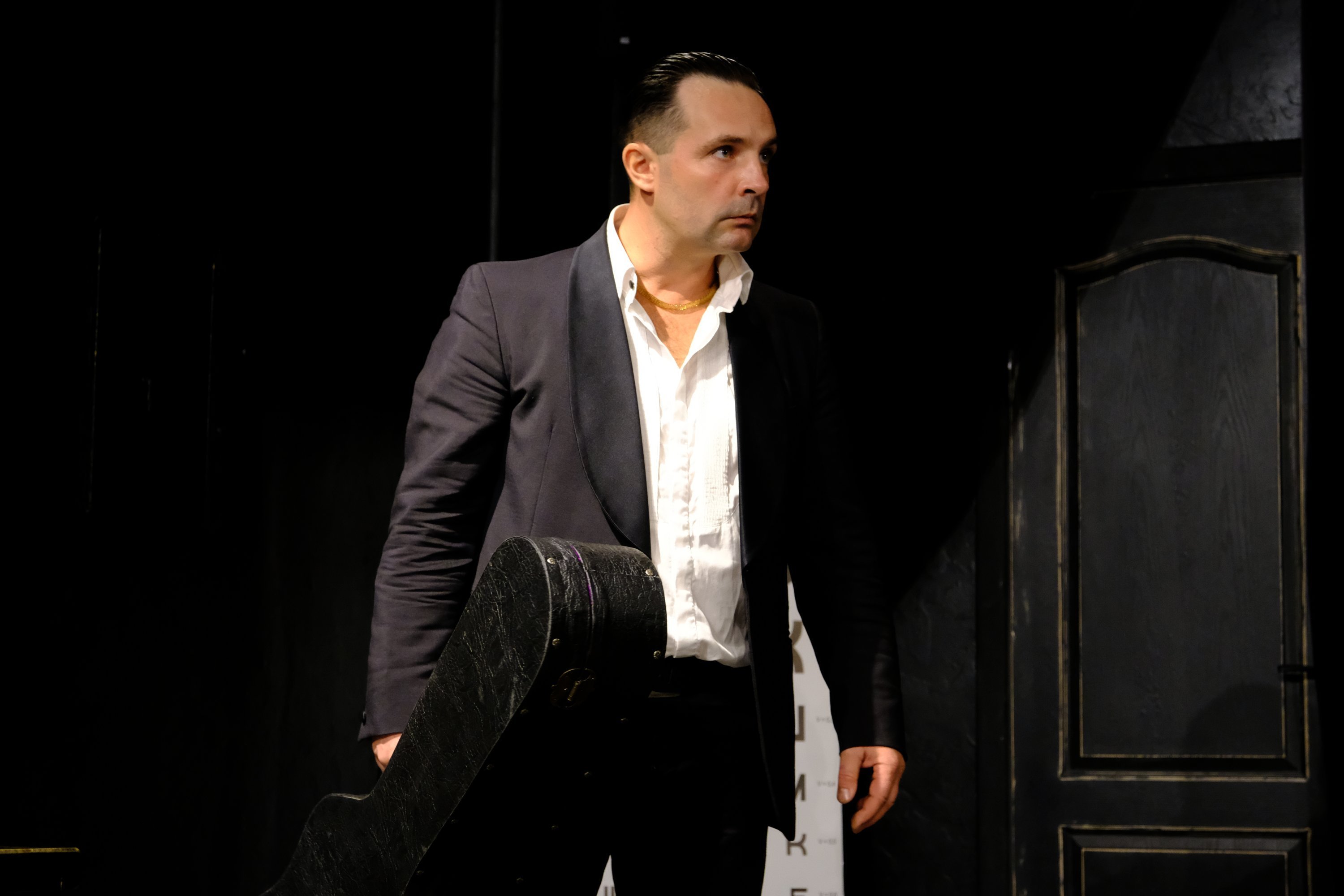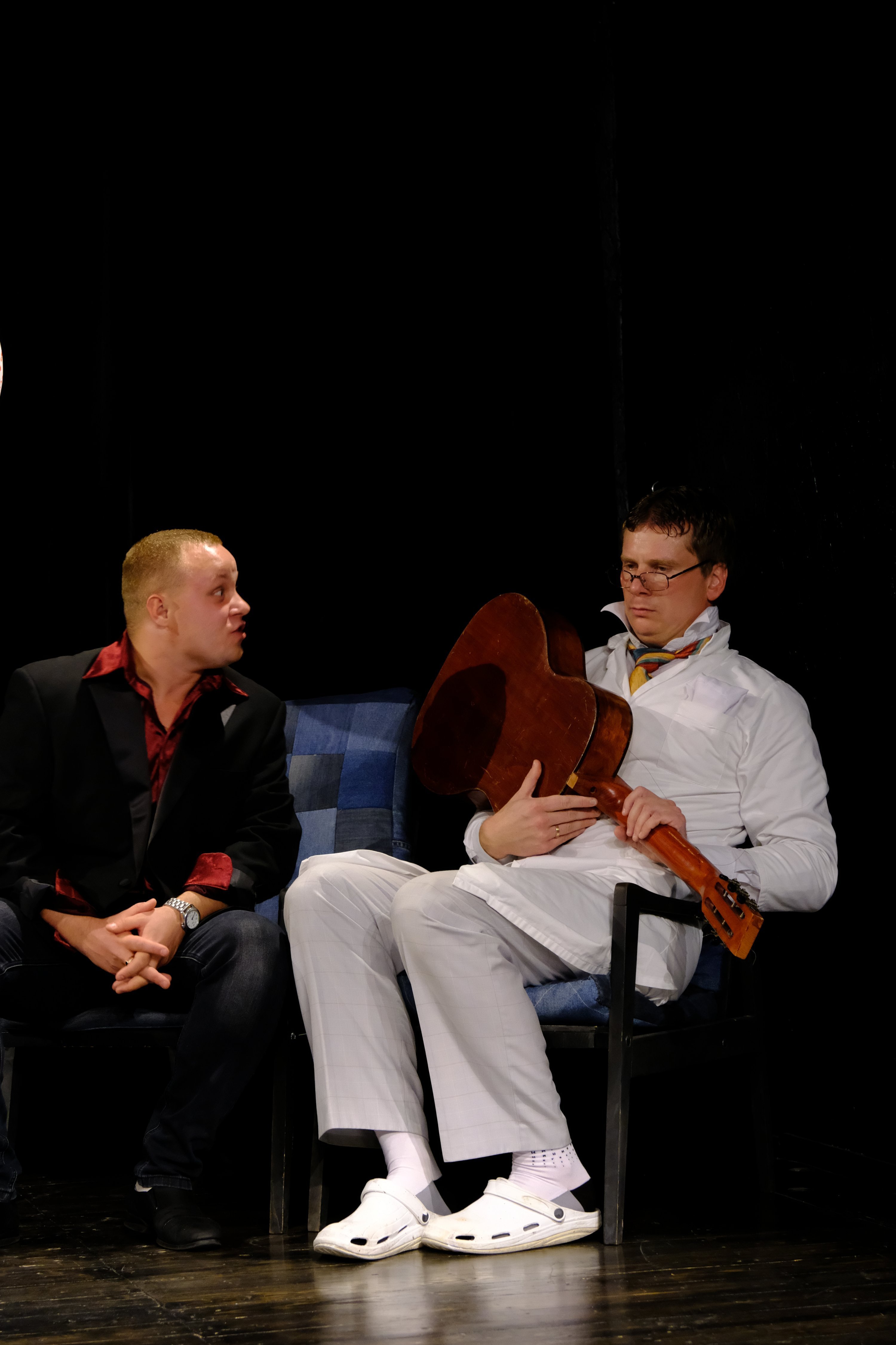 Говоря о комедии «Кароль» (в афише «МО» – кАроль»), Максим Воробьев отмечает, что она — о человеческой трусости. И с этим не поспоришь. К самой пьесе режиссер подошел вольно и несколько ее перекроил. Например, у Мрожека — дедушка, это, и правда, старик, а не матерый дед из криминального мира.