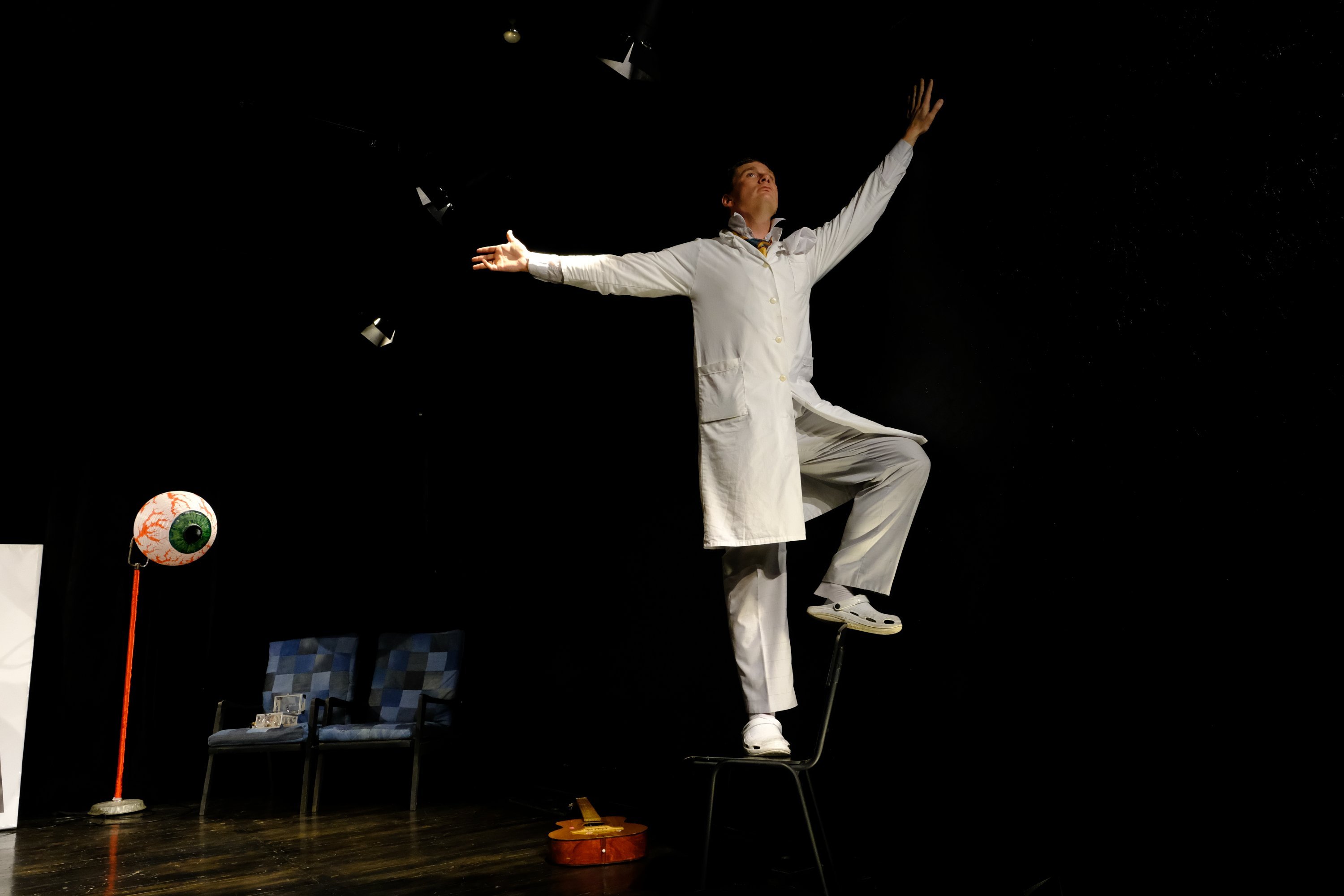 Режиссер и исполнитель главной роли Максим Воробьев поставил комедию польского драматурга Славомира Мрожека. Режиссер признается, что это его любимый автор. И это неудивительно: ситуации, в которые попадают герои Мрожека — и абсурдны, и одновременно жизненны — до безобразия. Именно такие до предела, гиперболически заостренные моменты любит показывать кременчугский театр «МО». Кстати, в его постановке зрители уже видели комедию «Вдовы» Славомира Мрожека.