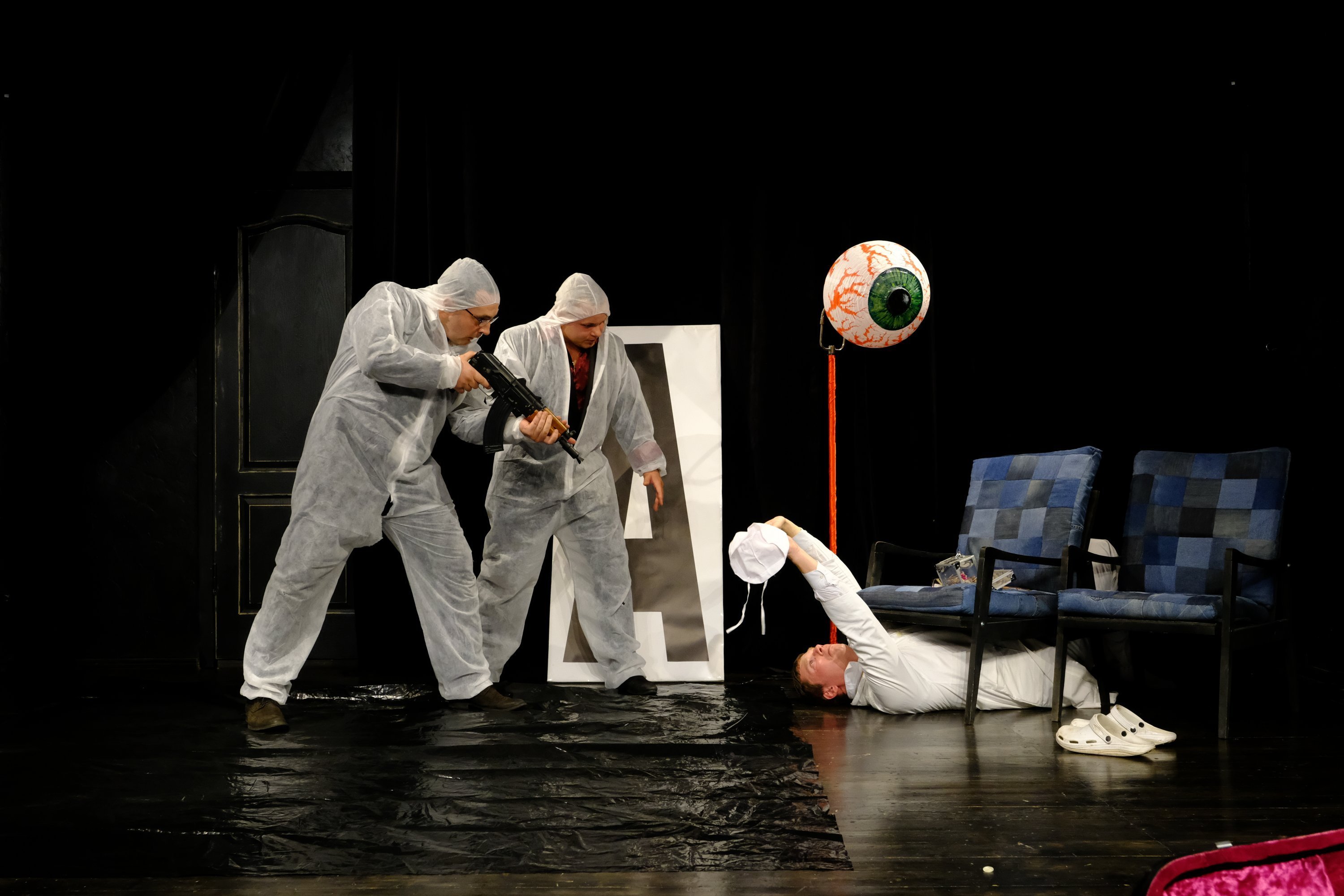 И, кстати, труп в полиэтиленовом мешке почему-то навевает ассоциации о коронавирусе… Спектакль в маленьком зале театра «МО» прошел в масках и в наполовину заполненном зале. Не потому, что нет зрителей, а потому, что меры безопасности.