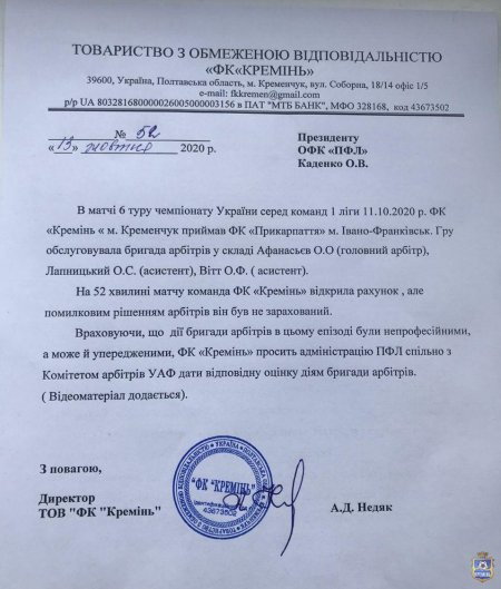 Футбольний клуб «Кремінь» направив лист у ПФЛ з проханням президента ПФЛ Олександра Каденка та Комітет арбітрів УАФ дати відповідну оцінку діям бригади арбітрів у матчі «Кремінь» - «Прикарпаття».