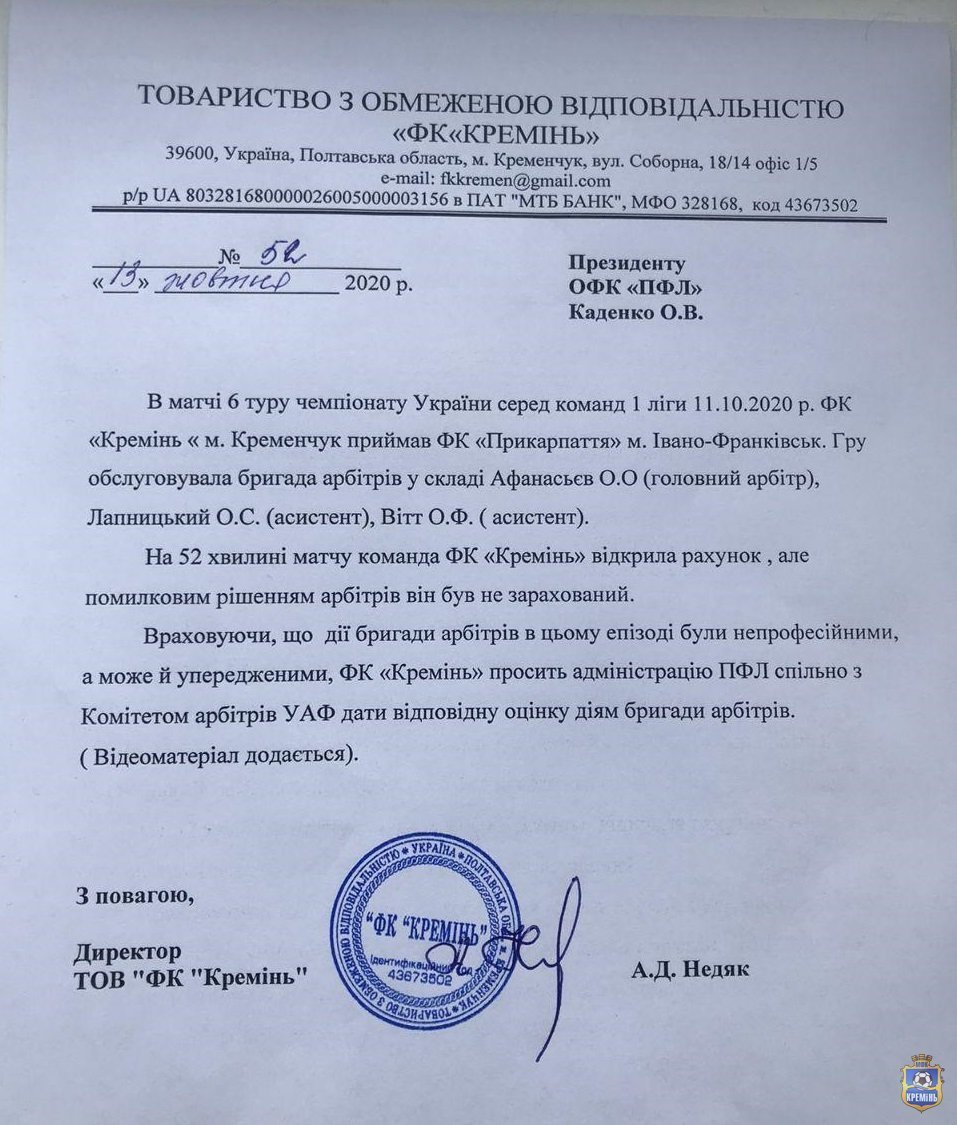 Футбольний клуб «Кремінь» направив лист у ПФЛ з проханням президента ПФЛ Олександра Каденка та Комітет арбітрів УАФ дати відповідну оцінку діям бригади арбітрів у матчі «Кремінь» – «Прикарпаття».