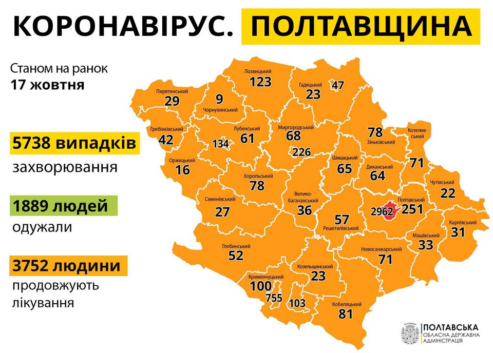 Одужали 1889 жителів області, продовжують лікування 3752 людини, зокрема, 156 дітей. Всього зареєстрували 97 летальних випадків, нових за добу – 5 (2 – у Полтаві, Кременчук, колишні Глобинський, Шишацький райони).