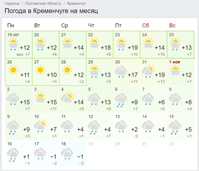 Ощутимое похолодание и ежедневные дожди придут в Кременчуг уже с 6 ноября, дневная температура с этой даты не поднимется выше +10°С, по ночам могут быть даже заморозки. А уже с 16 ноября в городе ударят морозы – столбики термометров покажут -1-2°С, и начнёт снежить.