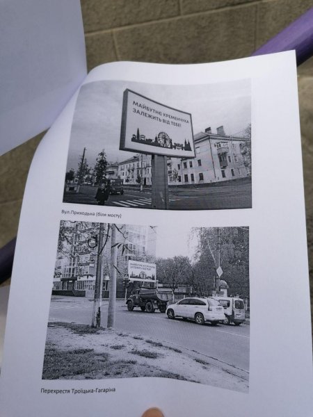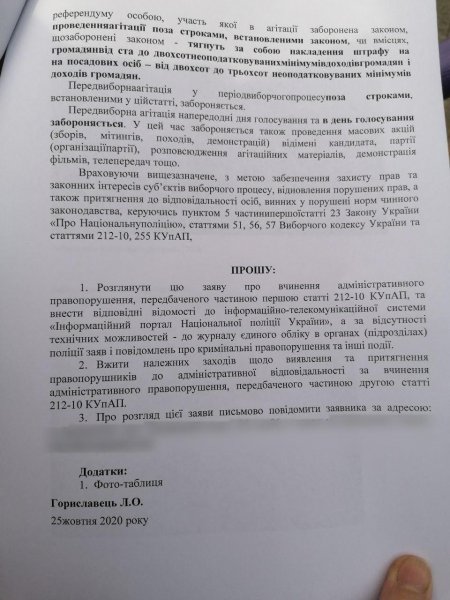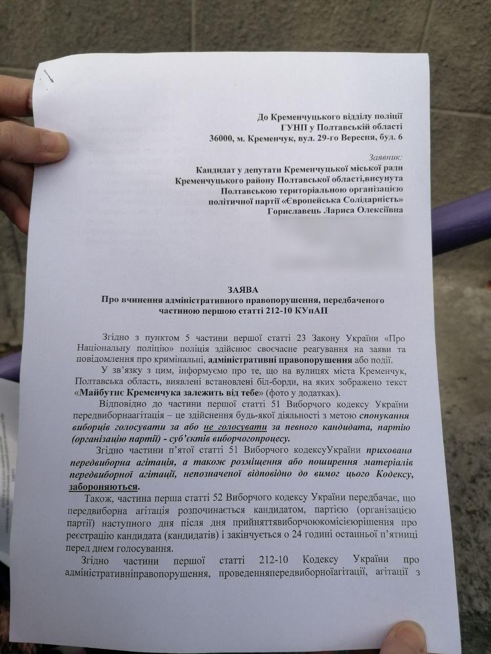 Плакати про «майбутнє» у різних частинах міста висіли у день тиші, висять вони й зараз. Сьогодні кандидат у депутати від ЄС до міськради Лариса Гориславець подала заяву до поліції щодо порушення у вигляді прихованої передвиборної агітації. Вона просить розглянути заяву про вчинення адміністративного правопорушення, передбаченого ст. 212-10 КупАП (порушення обмежень щодо ведення передвиборної агітації) та вжити заходи щодо притягнення порушників до адміністративної відповідальності.