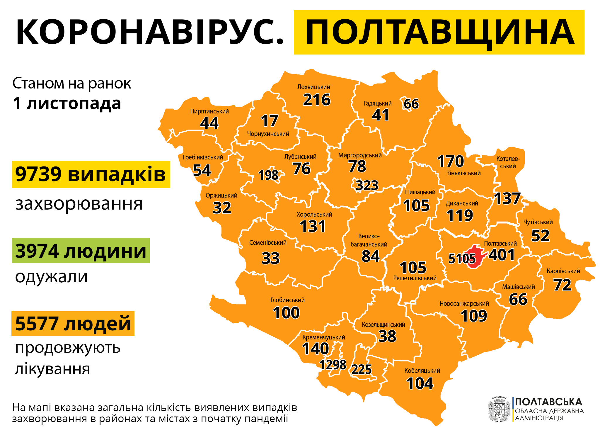За інформацією Полтавського обласного лабораторного центру МОЗ України, від початку карантину на Полтавщині діагностували 9 739 випадків захворювання на COVID-19. Одужали 3 974 жителі області, продовжують лікування 5 577 людей, зокрема 172 дитини.