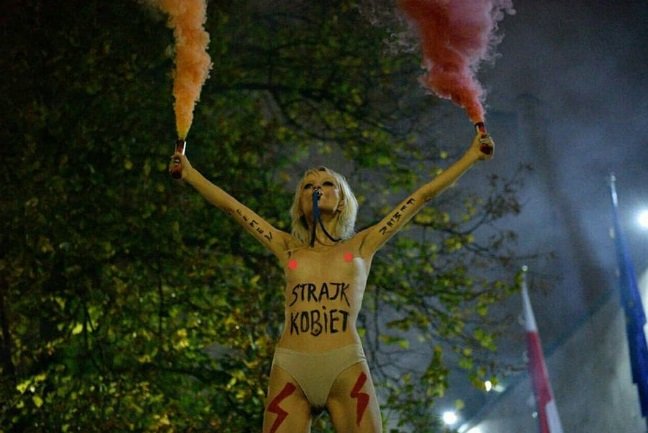 Вчора ввечері, 6 листопада, активістка Femen з Кременчука Анна Алляйн виступила проти заборони абортів у Польщі. Оголена активістка залізла на дах авто та запалиа фаєра.