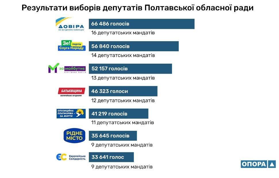 За підсумками голосування до Полтавської обласної ради восьмого скликання увійдуть депутати від 7 партій: «Рідне місто», «За майбутнє», «Опозиційна платформа – За життя», «Європейська солідарність», «Слуга народу», ВО «Батьківщина» та «Довіра».
