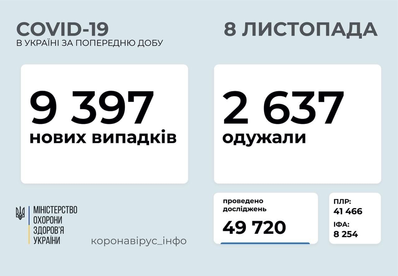 МОЗ повідомляє, що за минулу добу в Україні зафіксовано 9 397 нових випадків коронавірусної хвороби COVID-19 (з них дітей – 315, медпрацівників – 326).