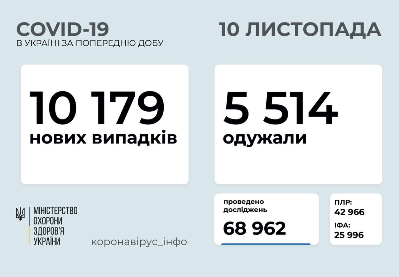 10 179 нових випадків коронавірусної хвороби COVID-19 зафіксовано в Україні на 10 листопада, повідомляє МОЗ. З них дітей - 410, медпрацівників – 445.