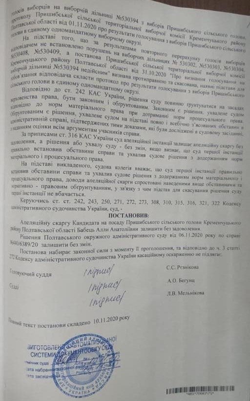 Нагадаємо, 6 листопада, суд задовольнив позов кандидата на посаду Пришибського сільського голови Валентини Городянко до Пришибського сільського тервиборчкому, в якому жінка просила скасувати постанову комісії про визнання голосування на дільниці Кобелячок недійсним.