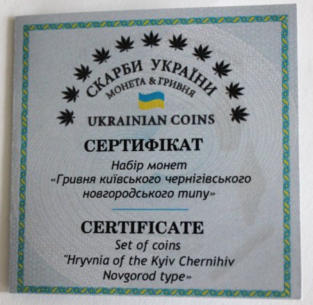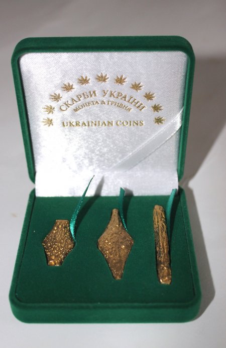 Повертаючись до подарунку Дмитра Васильовича, звертаю увагу, що мініатюри (вага яких 7 і 9 грамів) виготовлені з бронзи, ніби нагадуючи про золоті гривни. Верхня частина трохи опукла, нижня – плоска. На предметах ретельно відтворені дефекти лиття давньоруської гривни – численні раковини та нерівності. Набір гарно оформлений: він розміщений у симпатичному футлярі, обтягнутому оксамитом. До набору додається сертифікат.
