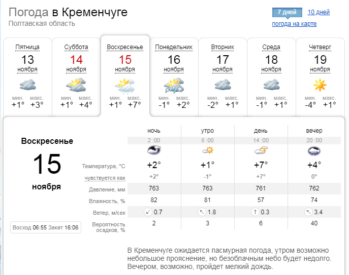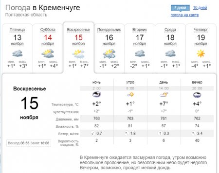 Gismeteo прогнозирует, что вечером в воскресенье, 15 ноября, пойдёт достаточно сильный дождь, который на утро понедельника, 16 ноября, перерастёт в мокрый снег. Температурные показатели в выходные будут колебаться в пределах +1...+8°С.