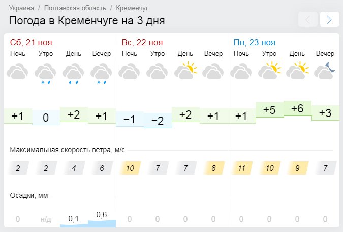 Ventusky не сообщает об осадках в выходные – в Кременчуге будет сухо, но преимущественно пасмурно. В воскресенье, 22 ноября, может подняться ветер до 17 км/час. Температурные показатели составят -2…+2°С.