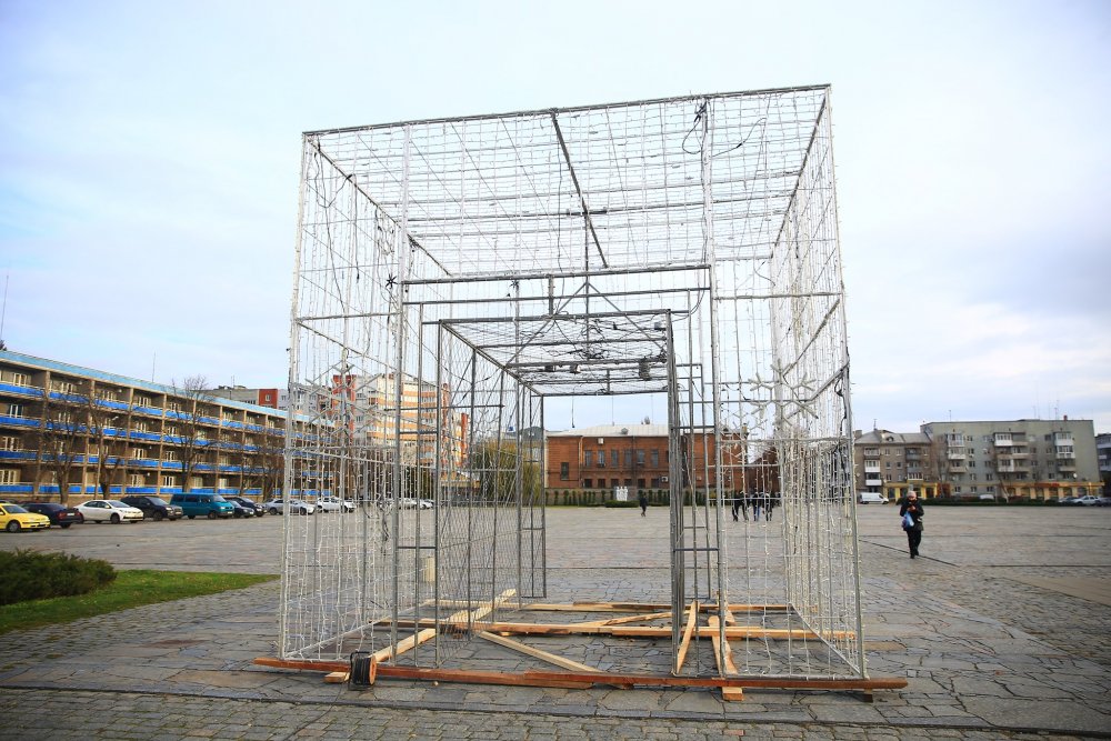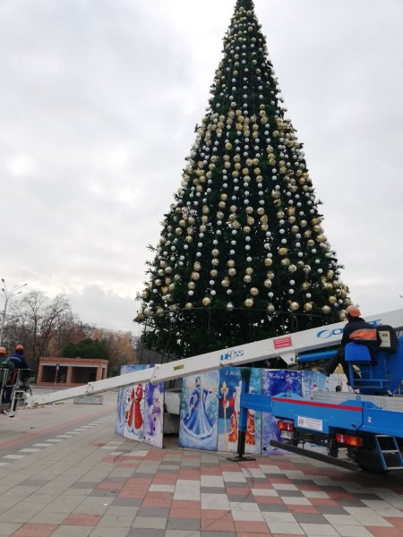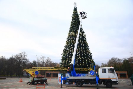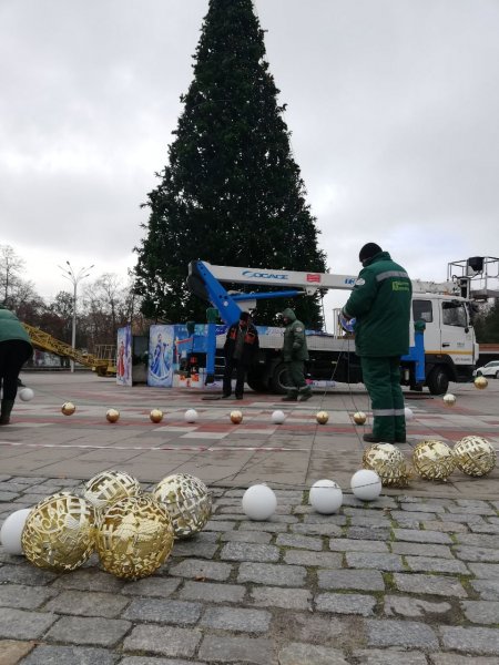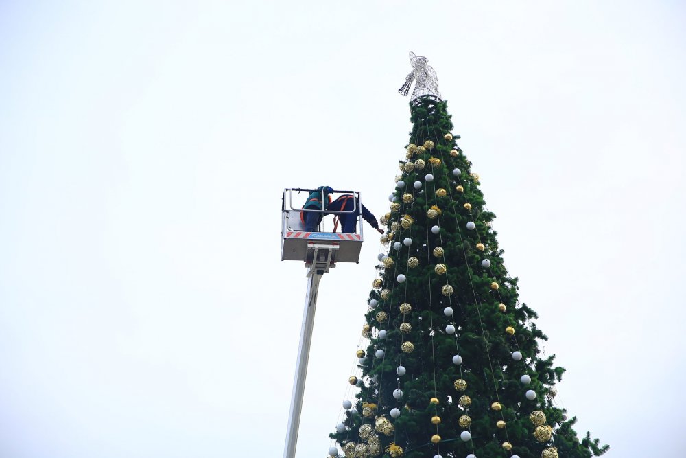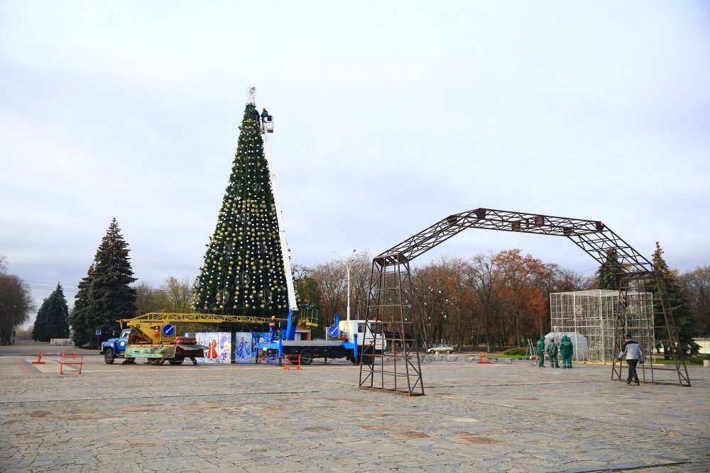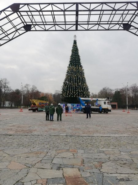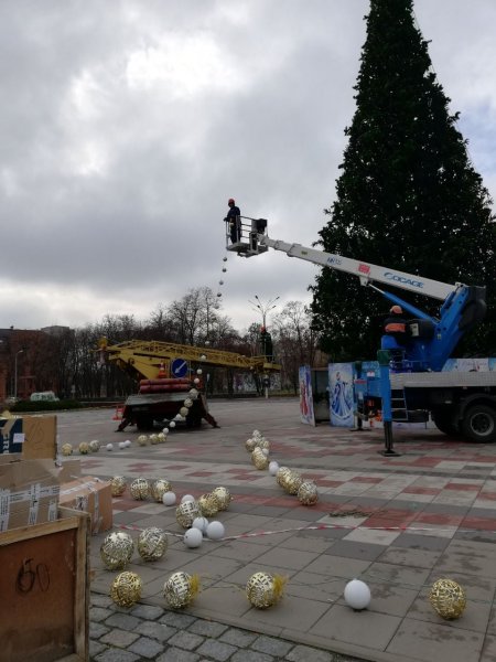 На площі Перемоги комунальники продовжують прикрашати новорічну ялинку, яку мають відкрити 19 грудня. Працівники «Благоустрою Кременчука» вдягли ялинку у біло-золоті буси.
