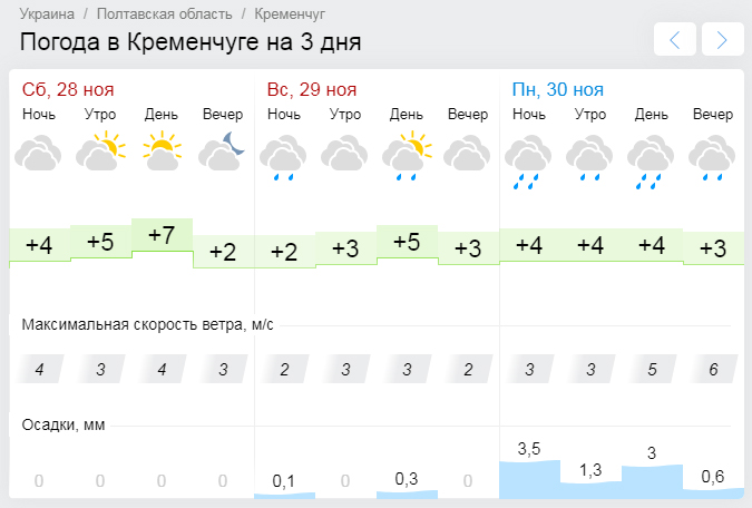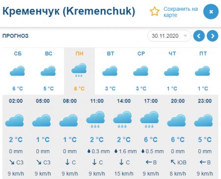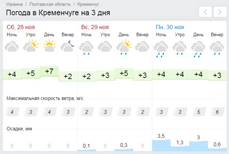 Ventusky обещает сухую и пасмурную погоду, а также температурный режим от +1°С до +5°С в выходные. А днём в понедельник, 30 ноября, в Кременчуге задождит – так что взять с собой зонтик не помешает – и поднимется ветер до 15 км/час.