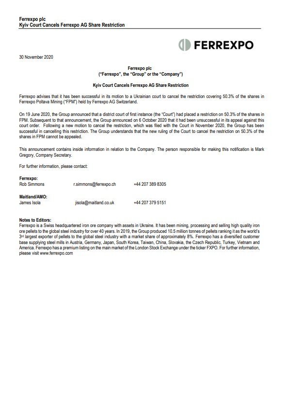 Згідно із заявою, компанія успішно позвалася до українського суду щодо скасування обмеження, яке охоплювало 50,3% акцій Ferrexpo Poltava Mining (FPM), які належать Ferrexpo AG Switzerland.
