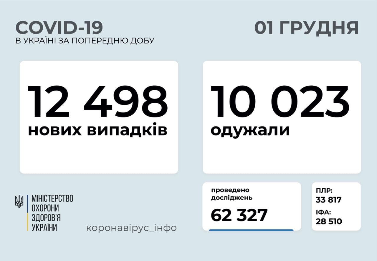 12 498 нових випадків коронавірусної хвороби COVID-19 зафіксовано в Україні станом на 1 грудня. Зокрема, захворіли 586 дітей та 646 медпрацівників.