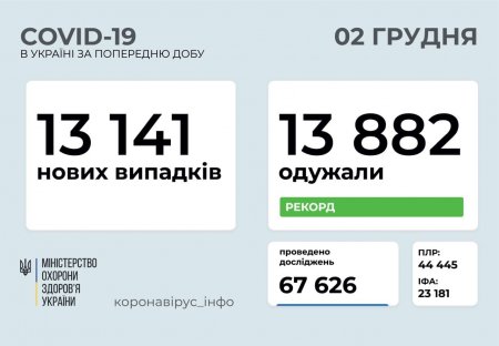 13 141 новий випадок коронавірусної хвороби COVID-19 зафіксовано в Україні станом на 2 грудня, повідомляє МОЗ. Зокрема, захворіли 744 дитини та 579 медпрацівників.