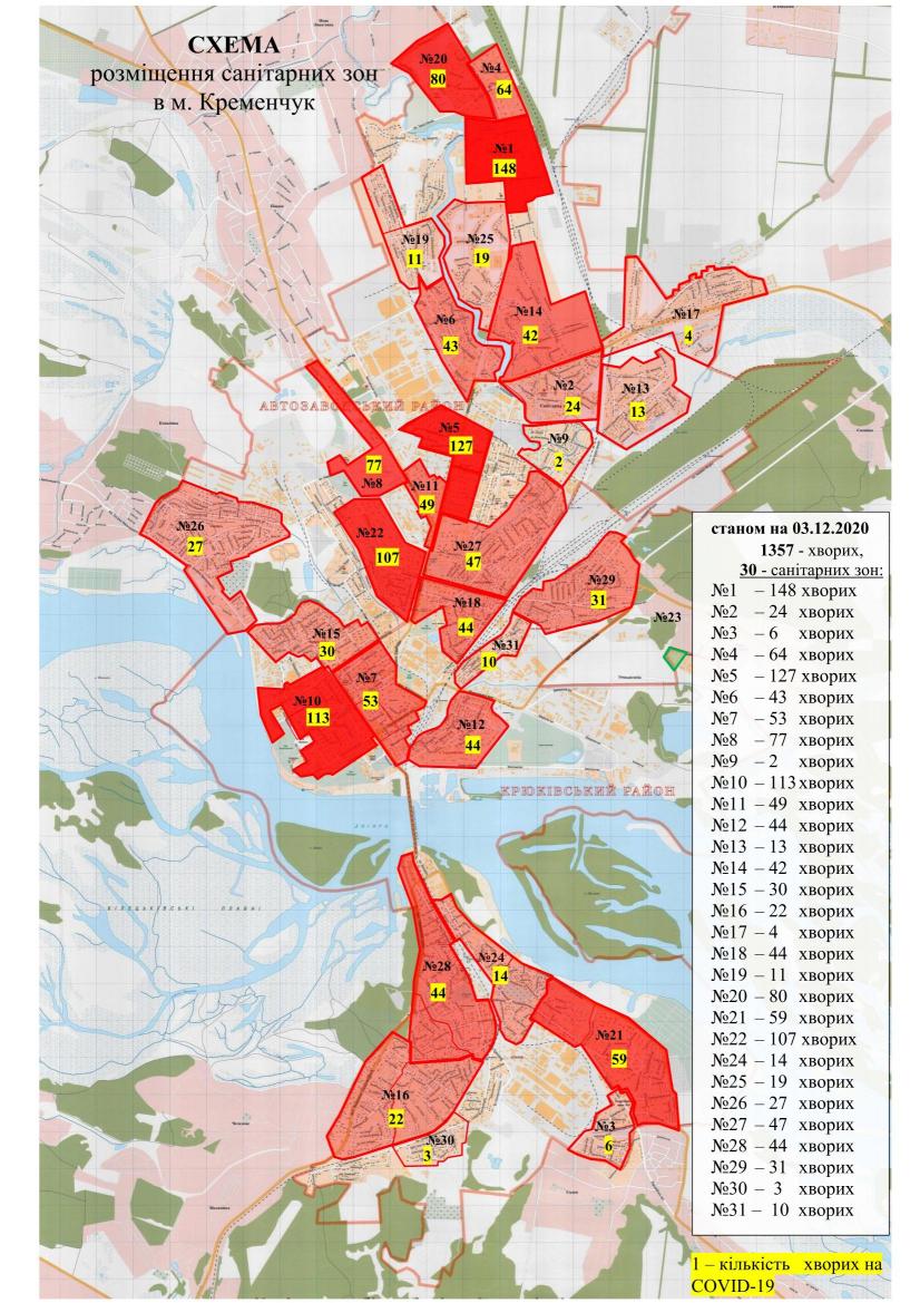У зв’язку з цими зареєстрованими випадками у місті діє 30 санітарних зон, де проживають кременчужани з підтвердженим діагнозом COVID-19.
