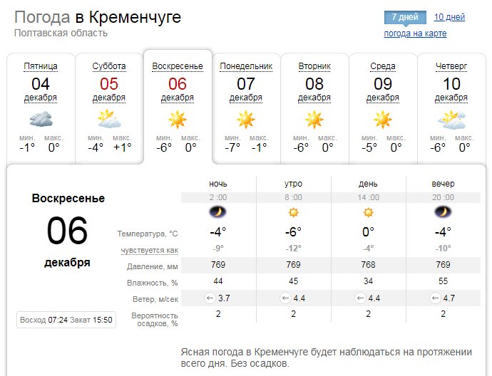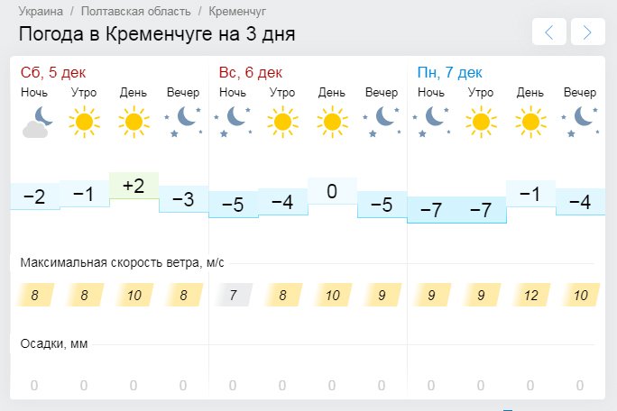 Ventusky даёт достаточно суровый прогноз на выходные дни: во-первых, обещает заморозки до -7°С, а ещё сильный ветер, до 22 км/час. Зато в Кременчуге будет солнечно и без осадков.