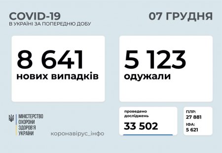 8 641 новий випадок коронавірусної хвороби COVID-19 зафіксовано в Україні станом на 7 грудня, повідомляє МОЗ. Зокрема, захворіли 390 дітей та 284 медпрацівники.